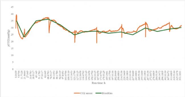 通過數(shù)據(jù)對(duì)比可看出,CO₂電極在pCO₂監(jiān)測(cè)方面與傳統(tǒng)離線樣品血?dú)鈾z測(cè)結(jié)果基本一致,對(duì)整個(gè)實(shí)驗(yàn)過程的pCO₂變化能夠進(jìn)行全流程監(jiān)控,更加真實(shí)地反應(yīng)實(shí)驗(yàn)過程變化,加強(qiáng)了對(duì)實(shí)驗(yàn)過程的進(jìn)一步理解。