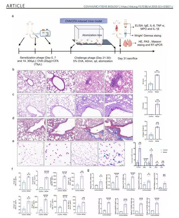 使用YSKD北京元森凱德生物技術(shù)公司研制生產(chǎn)的小動(dòng)物霧化給藥儀HY-JSE01,構(gòu)建OVA/CFA誘導(dǎo)的中性粒細(xì)胞哮喘小鼠模型和LPS誘導(dǎo)的人支氣管上皮細(xì)胞(16HBE)損傷模型。在中科院分區(qū):1區(qū), JCR分區(qū):Q1, 期刊名:Communications Biology,發(fā)表題為《Bronchial epithelial transcriptomics and experimental validation reveal asthma severityrelated neutrophilc signatures and potential treatments》