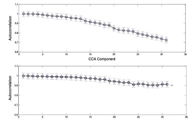 圖4. 青年( H1 ) "上"和老年( H2 ) "下"組31個(gè)估計(jì)源的CCA相關(guān)系數(shù)