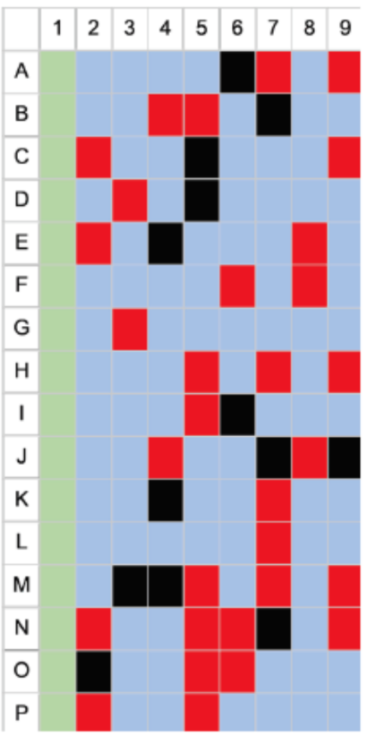 圖3:在MANTIS®液體處理器上分配的隨機(jī)布局示例:綠色-載體,藍(lán)色-細(xì)胞1型,紅色-細(xì)胞2型,黑色-控制(無(wú)細(xì)胞)。