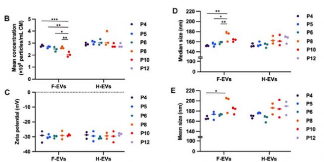 在比較 FBS 與 HPL 培養(yǎng)的 MSC-EVs 研究中(圖6),NTA 作為核心表征工具:測(cè)定 F-EVs 與 H-EVs 粒徑均約 150 nm,量化 H-EVs 顆粒濃度較 F-EVs 高 1.5 倍,證實(shí) HPL 促進(jìn) EVs 分泌;通過顆粒數(shù) / 蛋白質(zhì)量比驗(yàn)證兩者純度均超 1×10⁸ particles/μg,符合臨床級(jí)標(biāo)準(zhǔn)(圖7);在體外血管生成和體內(nèi)腎損傷模型中,基于 NTA 濃度數(shù)據(jù)實(shí)現(xiàn) EVs 給藥劑量的標(biāo)準(zhǔn)化控制。NTA 通過精準(zhǔn)量化 EVs 物理特性,為無動(dòng)物源培養(yǎng)基篩選、EVs 產(chǎn)量評(píng)估及功能實(shí)驗(yàn)標(biāo)準(zhǔn)化提供數(shù)據(jù)支撐,推動(dòng) MSC-EVs 在再生醫(yī)學(xué)中的機(jī)制研究與轉(zhuǎn)化應(yīng)用。