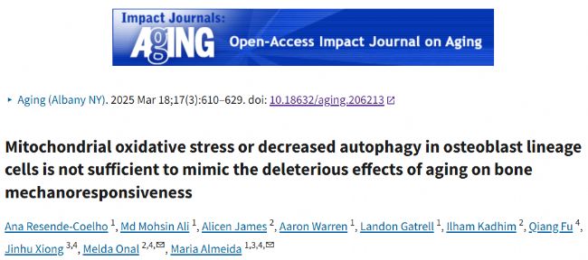 參考文獻(xiàn):Resende-Coelho A, Ali MM, James A, Warren A, Gatrell L, Kadhim I, Fu Q, Xiong J, Onal M, Almeida M. Mitochondrial oxidative stress or decreased autophagy in osteoblast lineage cells is not sufficient to mimic the deleterious effects of aging on bone mechanoresponsiveness. Aging (Albany NY). 2025 Mar 18;17(3):610-629. doi: 10.18632/aging.206213. Epub 2025 Mar 18. PMID: 40105873; PMCID: PMC11984430.