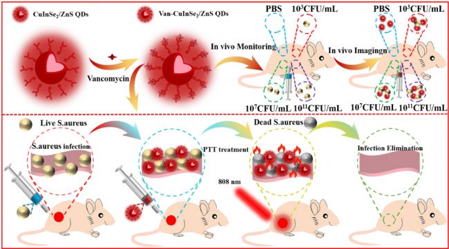 方案1. 基于Van-CuInSe2/ZnS量子點NIR-II發(fā)光的小鼠細菌性傳染病監(jiān)測與治療示意圖