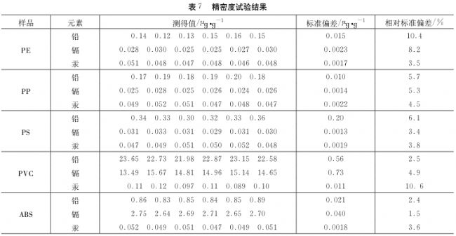 取PE、PP、PS、PVC、ABS等塑料樣品分別進行6次測定取置信度95%進行數(shù)據(jù)分析及取舍、計算方法的精密度結果如表7所示。對各塑料樣品加入定量鉛、鎘、汞標準溶液進行回收試驗回收率在93%~103%之間。
