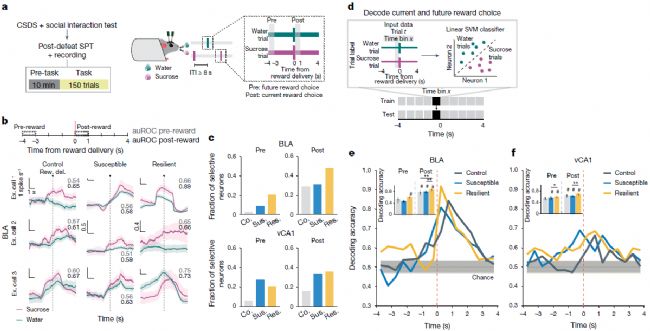 解釋韌性和易感個體行為差異的神經(jīng)機(jī)制仍不清楚,確定它們可能為如何治療抑郁提供關(guān)鍵見解。在負(fù)責(zé)產(chǎn)生情緒和動機(jī)行為的大腦網(wǎng)絡(luò)中,相互連接的杏仁核和腹側(cè)海馬是兩個關(guān)鍵節(jié)點(diǎn)。BLA可以通過獎賞來指導(dǎo)決策。vCA1已被證明可以編碼預(yù)測獎賞的刺激,并推動與獎賞相關(guān)的行為。然而,這些vCA1和BLA的獎賞相關(guān)功能如何受到情緒狀態(tài)變化的影響仍不清楚。同樣不清楚的是在沒有任務(wù)刺激的情況下,BLA或vCA1中的自發(fā)活動模式在易感或韌性小鼠中有何不同,以及針對這一回路的靶向干預(yù)是否可能減少對壓力的易感性。