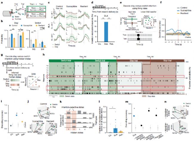 接下來,作者通過分析導(dǎo)致易感小鼠較少選擇蔗糖獎賞的獎賞選擇序列,并將其與控制組和韌性小鼠的序列進(jìn)行比較,來檢查易感小鼠中快感缺失行為的性質(zhì)。作者發(fā)現(xiàn)控制組和韌性小鼠都比易感小鼠更頻繁地從水轉(zhuǎn)換到蔗糖,并重復(fù)選擇蔗糖(圖3a-b)。相比之下,易感小鼠更頻繁地從蔗糖轉(zhuǎn)換到水獎賞,并做出更多的連續(xù)選擇水的行為。單神經(jīng)元分析揭示,只有在易感小鼠的BLA中存在基于切換獎賞或保持與前一個試驗(yàn)相同的意向而不同調(diào)節(jié)的神經(jīng)元(圖3c-d)。