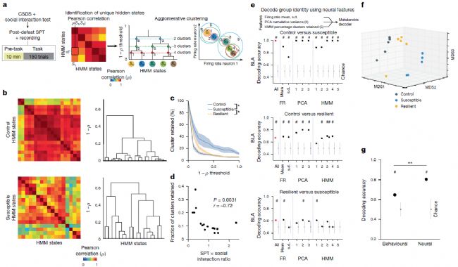 作者發(fā)現(xiàn)在BLA(而不是vCA1)中,易感小鼠顯示出更多的獨(dú)特神經(jīng)狀態(tài)(圖5a-c)。這表明BLA中的群體隱藏狀態(tài)的結(jié)構(gòu)可能反映了與快感缺失相關(guān)的行為。最后,作者發(fā)現(xiàn),在BLA中使用這些神經(jīng)特征的解碼器在無刺激的任務(wù)前期更好地預(yù)測動物是否暴露于壓力,而不是僅使用與快感缺失和焦慮相關(guān)的行為測量的解碼器(圖5g)。這表明,在沒有刺激或任務(wù)要求的情況下,BLA中的神經(jīng)活動特征可能是識別慢性壓力歷史的強(qiáng)大生物標(biāo)志物,比經(jīng)典的社交回避和與快感缺失相關(guān)的行為等行為指標(biāo)更為強(qiáng)大。
