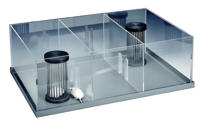 社會交互行為測試(也叫3-Chambered Social Test)是最常用的用于評估自閉癥行為的實(shí)驗(yàn)。動物交際實(shí)驗(yàn)系統(tǒng)設(shè)計(jì)是在小鼠熟悉了環(huán)境后,檢測小鼠靠近位于實(shí)驗(yàn)箱中裝有另一只陌生小鼠的金屬籠的時間,來判斷小鼠的社交能力。在實(shí)驗(yàn)中,通常會比較小鼠靠近關(guān)有熟悉小鼠的金屬籠時間與陌生小鼠金屬籠的時間,來判斷動物的社交能力。