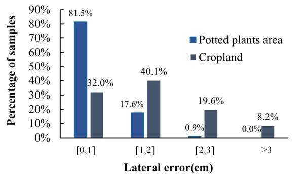 在團(tuán)隊(duì)自主研發(fā)的表型機(jī)器人上,針對(duì)盆栽及田間種植作物開展實(shí)驗(yàn)。結(jié)果顯示,該方法在提取盆栽植物區(qū)行中心線的平均絕對(duì)誤差(MAE)為2.83厘米,農(nóng)田區(qū)為4.51厘米。在盆栽植物區(qū),99.1%的全局路徑跟蹤誤差處于2厘米范圍內(nèi),平均絕對(duì)誤差達(dá)0.62厘米,最大誤差為2.59厘米;農(nóng)田區(qū)72.4%的誤差在2厘米范圍內(nèi),平均絕對(duì)誤差為1.51厘米,最大誤差為4.22厘米。相較于傳統(tǒng)基于全球?qū)Ш叫l(wèi)星系統(tǒng)(GNSS)的導(dǎo)航方法和單視覺方法,該方法在應(yīng)對(duì)作物動(dòng)態(tài)生長(zhǎng)與復(fù)雜田間環(huán)境時(shí)優(yōu)勢(shì)顯著。