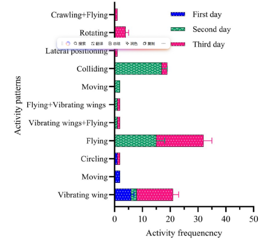 對未交配成年雌性Spodoptera frugiperda的行為觀察。該實(shí)驗(yàn)分為三組:第一組,將兩只成年個體(一雌一雄)放置于Track 3D的觀察箱中;成年雌性個體可以在觀察箱內(nèi)自由移動,而成年雄性個體則被固定在一個圓形透明盒子內(nèi)。連續(xù)三個晚上的記錄被認(rèn)為是一個重復(fù)。在第二組中,將兩只成年個體(一雌一雄)放置于Track 3D的觀察箱中,一只成年雄性個體可以在觀察箱內(nèi)自由移動,而成年雌性個體則被固定在一個圓形透明盒子內(nèi)。連續(xù)三個晚上的記錄被認(rèn)為是一個重復(fù)。在第三組中,將兩只成年個體(一雌一雄)放置于Track3D的觀察箱中。成年雄性和雌性個體都可以在箱內(nèi)自由移動。一個晚上的記錄被認(rèn)為是一個重復(fù)。