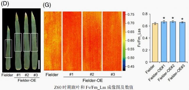 FluorCam葉綠素?zé)晒獬上裣到y(tǒng),在灌漿期(Z60)測(cè)定對(duì)照組Fielder和轉(zhuǎn)基因小麥Fielder-OE旗葉的 Fv/Fm_lss(光適應(yīng)穩(wěn)態(tài)下的PSII最大光化學(xué)效率)。