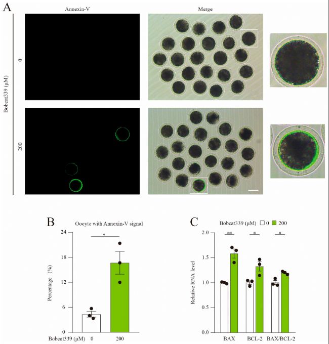 (A)對(duì)照組和經(jīng)Bobcat339處理的卵母細(xì)胞的早期凋亡熒光信號(hào)。