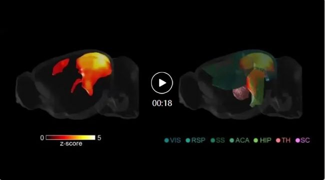 彩色標(biāo)注顯示激活腦區(qū)(n=10只小鼠),右側(cè)標(biāo)注關(guān)鍵腦區(qū)縮寫。除圖1E所示區(qū)域外,體感皮層(SS)與海馬(HIP)也有響應(yīng)。VIS:視覺相關(guān)區(qū)域。