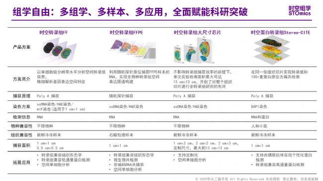 依托Stereo-seq,華大時空組學推出了適用于新鮮冷凍樣本的時空轉(zhuǎn)錄組FF V1.3、適用于石蠟包埋樣本的時空轉(zhuǎn)錄組FFPE、適用于大尺寸組織的時空轉(zhuǎn)錄組大尺寸芯片,以及時空蛋白轉(zhuǎn)錄組Stereo-CITE等產(chǎn)品解決方案,幫助科研人員進一步提升研究的廣度與深度。