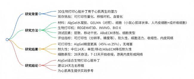 本研究聚焦于利用藻酸鹽 - 明膠(AlgGel)水凝膠通過(guò) 3D 生物打印技術(shù)制備心臟補(bǔ)丁,評(píng)估其可打印性、培養(yǎng)耐久性、細(xì)胞活力、心肌收縮性及內(nèi)皮細(xì)胞網(wǎng)絡(luò)形成能力。使用 REGEMAT3D、INVIVO、BIO X 三種擠出式生物打印機(jī),對(duì)比 AlgGel 與明膠甲基丙烯酰(GELMA)水凝膠,發(fā)現(xiàn) AlgGel 打印精度(45%)顯著高于 GELMA(25%,p<0.05),形狀保真度相近(92% vs 96%,p=0.36);AlgGel 補(bǔ)丁中位耐久性為 14 天(IQR 10-27),單層結(jié)構(gòu)、移動(dòng)干擾及添加 AlloECM 會(huì)降低耐久性,而生物打印機(jī)類型和細(xì)胞內(nèi)容物影響較小。細(xì)胞在打印后 28 天仍存活(活力約 53%),BIO X 打印的小鼠心肌球狀體補(bǔ)丁在 7-13 天開始收縮,游離內(nèi)皮細(xì)胞可形成類血管網(wǎng)絡(luò)。研究建議,移植最佳時(shí)間為打印后 14 天左右,以平衡組織成熟與補(bǔ)丁完整性。