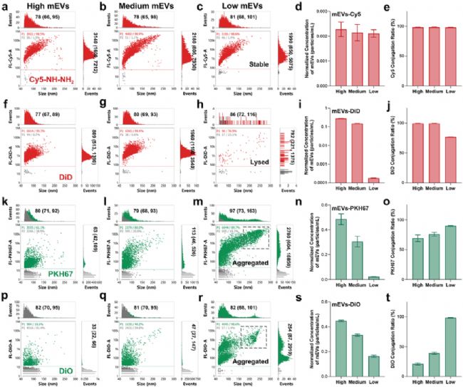 研究者利用 NanoFCM 對聚糖錨熒光標(biāo)記方法與親脂染料標(biāo)記方法從標(biāo)記效率、穩(wěn)定性以及對囊泡特性的影響進行系統(tǒng)比較。結(jié)果顯示,聚糖錨定標(biāo)記法在所有測試的 mEVs 濃度下,均展現(xiàn)出近乎 100% 的標(biāo)記效率,且不會引發(fā)囊泡的聚集或裂解(圖3a-d),充分顯示出該方法的高效性與穩(wěn)定性。而親脂性染料(如 DiD、PKH67、DiO)的標(biāo)記效果則因濃度依賴性導(dǎo)致結(jié)果不穩(wěn)定,低濃度時標(biāo)記效率不足,高濃度則導(dǎo)致 mEVs 聚集、裂解和染料自聚集(圖3)。