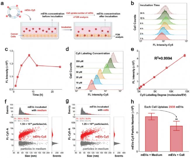 研究者將 mEVs-Cy5 與 MCF-7 細胞共同孵育,通過流式細胞術(shù)(FCM)檢測發(fā)現(xiàn),隨著孵育時間的延長,細胞的熒光強度在 8 小時達到峰值,隨后略有下降,表明 mEVs 攝取存在飽和狀態(tài)(圖4b, c)。此外,研究發(fā)現(xiàn)細胞的熒光強度與 Cy5 標(biāo)記密度呈嚴(yán)格的線性關(guān)系,這充分說明標(biāo)記過程并未影響 mEVs 的細胞攝取能力(圖4d)。進一步,通過 NanoFCM 對細胞培養(yǎng)基中 mEVs-Cy5 的濃度變化進行準(zhǔn)確定量。結(jié)果顯示,與 MCF-7 細胞共孵育后,mEVs-Cy5 的濃度顯著降低,證實細胞成功攝取了 mEVs。經(jīng)基于濃度變化的計算,每個 MCF-7 細胞平均攝取了約 2938 個 mEVs(圖4h)。