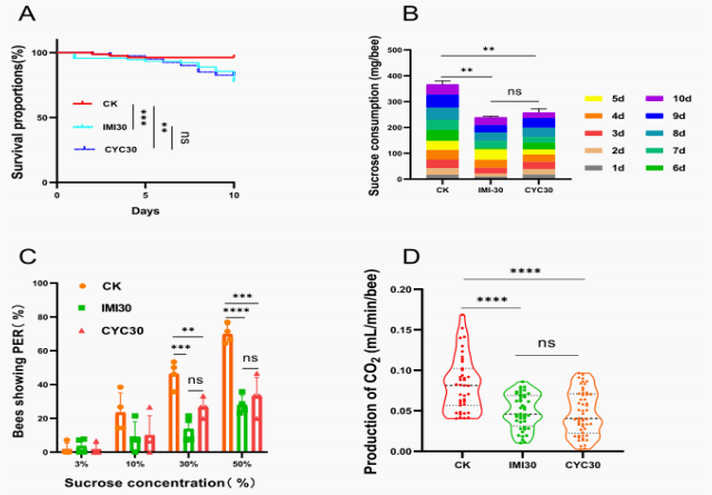 圖為長(zhǎng)期接觸10天后環(huán)氧蟲(chóng)啶對(duì)蜜蜂的毒性作用。CYC:環(huán)氧蟲(chóng)啶;IMI:吡蟲(chóng)啉,陽(yáng)性對(duì)照化合物;A:生存暴露期間蜜蜂存活占比曲線;B:每只蜜蜂累計(jì)消耗50%蔗糖溶液;C:蜜蜂對(duì)不同濃度蔗糖溶液的響應(yīng)速率;D:CYC-或IMI處理后蜜蜂的呼吸代謝能力。