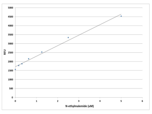 圖為使用NOVOstar酶標(biāo)儀(BMG Labtech),在具有Amplite 熒光馬來酰亞胺定量測(cè)定試劑盒的96孔板(黑色)中測(cè)量N-乙基馬來酰亞胺劑量響應(yīng)。