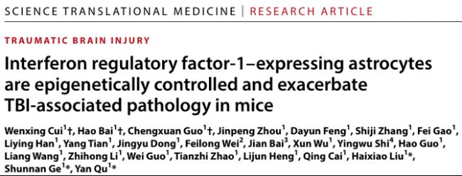 Cui W, Bai H, Guo C, Zhou J, Feng D, Zhang S, Gao F, Han L, Tian Y, Dong J, Wei F, Bai J, Wu X, Shi Y, Guo H, Wang L, Li Z, Guo W, Zhao T, Heng L, Cai Q, Liu H, Ge S, Qu Y. Interferon regulatory factor-1-expressing astrocytes are epigenetically controlled and exacerbate TBI-associated pathology in mice. Sci Transl Med. 2025 May 28;17(800):eadr5300. doi: 10.1126/scitranslmed.adr5300.