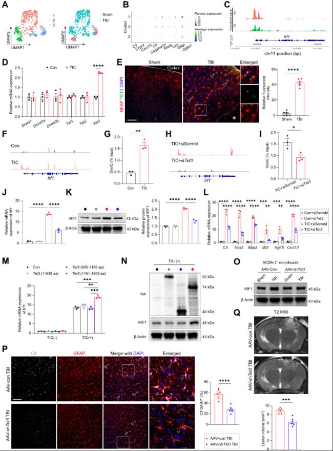 (O) Western blot分析TBI或假手術(shù)后第3天,經(jīng)shTet3 AAV或?qū)φ誂AV轉(zhuǎn)導(dǎo)的分離星形膠質(zhì)細(xì)胞中IRF1蛋白表達(dá)。