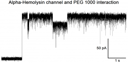 PEG-25 分子(濃度10 µM)在 -100 mV電壓、20 kHz采樣率(帶寬10 kHz)下通過(guò)單個(gè)α-溶血素(α-Hemolysin)納米孔的易位記錄。該蛋白質(zhì)被嵌入由DPhPC(二植烷酰磷脂酰膽堿)構(gòu)成的脂質(zhì)雙層膜中,此膜涂覆于帶有150 µm孔徑的BLM芯片上。記錄溶液含3M KCl、20 mM TRIS,pH 8。