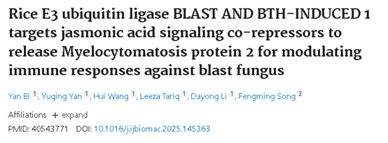 2025年6月,浙江大學(xué)生物技術(shù)研究所宋鳳鳴團(tuán)隊(duì)在《International Journal of Biological Macromolecules》發(fā)表了題為“Rice E3 ubiquitin ligase BLAST AND BTH-INDUCED 1 targets jasmonic acid signaling co-repressors to release Myelocytomatosis protein 2 for modulating immune responses against blast fungus”的研究論文。本研究借助DAP-seq技術(shù),深入探索了OsBBI1調(diào)控水稻免疫的分子網(wǎng)絡(luò),揭示了其通過降解JA信號(hào)抑制因子、釋放關(guān)鍵轉(zhuǎn)錄因子的完整抗病通路。