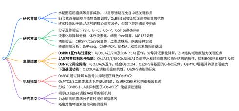 該研究突破了傳統(tǒng)對(duì)JA信號(hào)調(diào)控的認(rèn)知,構(gòu)建了“OsBBI1→降解JA抑制因子→釋放OsMYC2→激活防御基因”的完整調(diào)控鏈,證實(shí)E3泛素連接酶可通過“降解抑制因子”的方式快速激活免疫,為作物抗病機(jī)制研究提供了新思路。