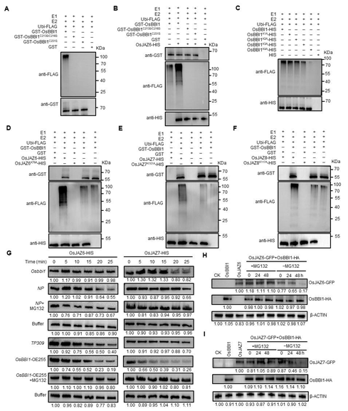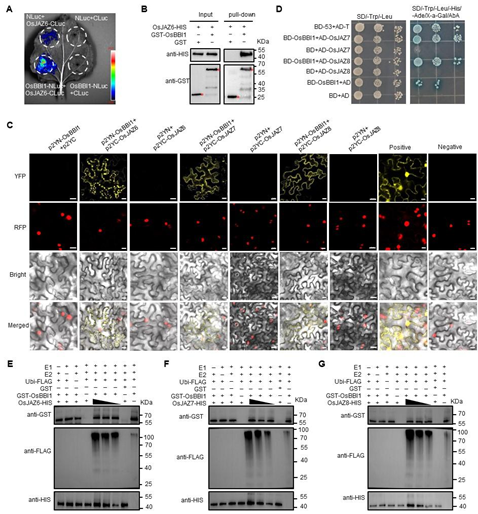 圖1. OsBBI1與OsJAZ6、OsJAZ7和OsJAZ8相互作用并使其泛素化。