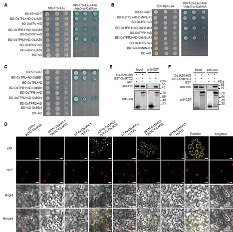 圖5. OsBBI1、OsJAZ6和OsNINJA1與OsTPL、OsTPR2、OsMYC2及OsMYC3存在相互作用。