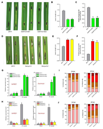圖6. OsMYC2和OsMYC3對(duì)水稻稻瘟病抗性起正向調(diào)控作用。