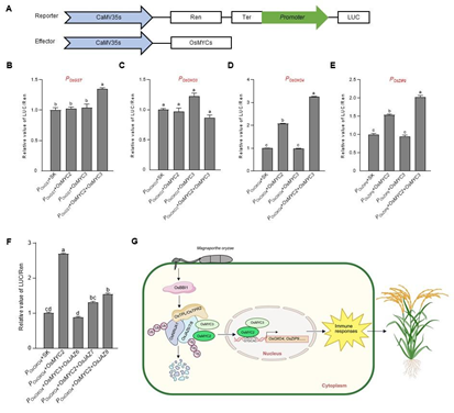 圖7. OsMYC2通過結(jié)合啟動(dòng)子中的G-box元件調(diào)控OsGST、OsOXO3、OsOXO4和OsZIP9的表達(dá)。