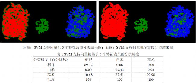 基于特征波段,采用 SVM 支持向量機分類法對三種稻米建模分類,其中糙米和稻谷分類精度較高,分別達 99.98% 和 89.32%,白米分類精度為 72.43%;基于全波段的 SVM 分類結(jié)果為稻谷 94.51%、糙米 98.73%、白米 86.27%,雖分類精度有所提升,但耗時大幅增加。結(jié)果表明,剔除冗余波段后,分類更具效率且準確。