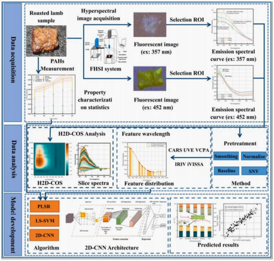 利用生物熒光高光譜成像技術(shù)定量測定烤灘羊肉中 T-PAHs(引自Jie Hao etc. 2023. Quantification of polycyclic aromatic hydrocarbons in roasted Tan lamb using fluorescence hyperspectral imaging technology. Journal of Food Composition and Analysis)