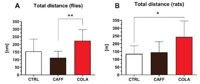 急性可樂(lè)攝入導(dǎo)致果蠅和大鼠的運(yùn)動(dòng)活性以類(lèi)似的方式升高。令人驚訝的是,單純的咖啡因攝入并沒(méi)有導(dǎo)致果蠅或大鼠的活性升高。