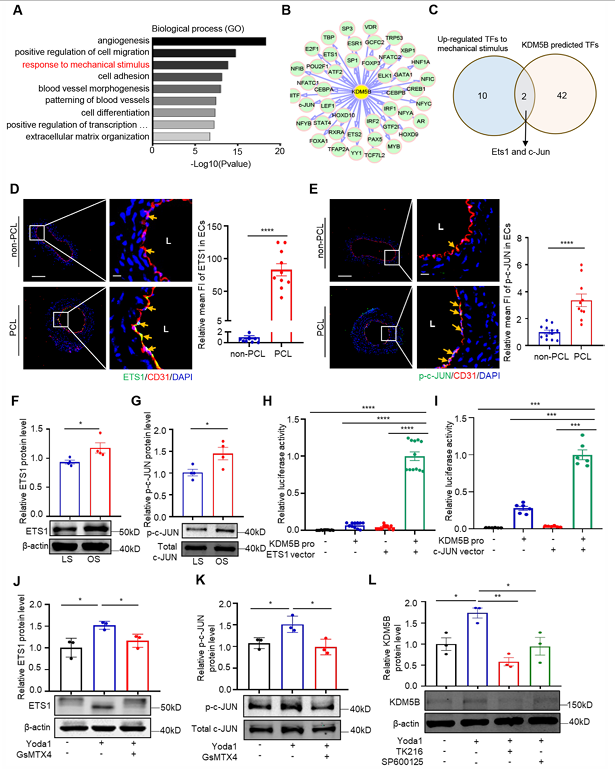 接下來,為了探究 Piezo1 如何調(diào)節(jié)紊亂血流(d-flow)誘導(dǎo)的 KDM5B 表達,研究人員首先通過 scRNA-seq 分析篩選出 PCL 手術(shù) 7 天后頸動脈內(nèi)皮細胞中響應(yīng)機械刺激的關(guān)鍵基因。經(jīng) GO 分析發(fā)現(xiàn) 12 個基因在 “機械刺激響應(yīng)” 類別中顯著富集(圖 3A )。隨后利用生物信息學(xué)工具預(yù)測 KDM5B 轉(zhuǎn)錄因子,發(fā)現(xiàn) 44 個預(yù)測因子中 ETS1 和 c-JUN 與機械刺激響應(yīng)基因重疊(圖 3B、C )。進一步通過免疫染色實驗證實,PCL 手術(shù)的左側(cè)頸動脈內(nèi)皮細胞中 ETS1 和磷酸化 c-JUN 水平高于未手術(shù)的右側(cè)頸動脈(圖 3D、E) ,且暴露于振蕩切應(yīng)力的人臍靜脈內(nèi)皮細胞中這兩種分子的表達水平也顯著高于層流切應(yīng)力條件下的細胞(圖 3F、G) 。這些結(jié)果表明,Piezo1 可能通過 ETS1 和 c-JUN 介導(dǎo),在紊亂血流條件下調(diào)控內(nèi)皮細胞中 KDM5B 的表達。