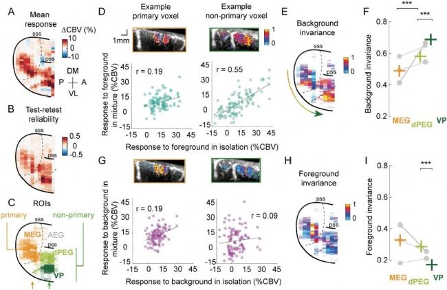 (A)一個示例半球(雪貂 L)的平均反應(yīng)圖。反應(yīng)以相對于安靜時期基線活動的 CBV 百分比變化表示。對深度方向的值進(jìn)行平均,得到聽覺皮層的表面視圖。(B)重測信度圖。在以下各圖中,僅顯示有可靠反應(yīng)的體素(至少在一種聲音類別中重測信度 > 0.3),圖中表面單元的透明度由納入平均的(可靠)體素數(shù)量決定。(C)基于解剖學(xué)標(biāo)志的感興趣區(qū)域(ROIs)圖。箭頭指示圖 D 中所示的示例切片(橙色:初級;綠色:非初級示例)。(D)對單獨(dú)呈現(xiàn)和混合呈現(xiàn)的前景音的反應(yīng)。底部:示例體素(左:初級;右:非初級)對混合音和單獨(dú)呈現(xiàn)的前景音的反應(yīng)。每個點(diǎn)代表體素對每個前景音(x 軸)和混合音(y 軸)的時間平均反應(yīng),取兩次重復(fù)的平均值。r 表示皮爾遜相關(guān)系數(shù)值。頂部:圖中顯示不變性,定義為混合音和單獨(dú)呈現(xiàn)的前景音之間的噪聲校正相關(guān)性,示例體素所在切片的值疊加在代表基線 CBV 的解剖學(xué)圖像上。示例體素用白色方塊標(biāo)記。(E)同一半球的背景不變性圖。(F)每個 ROI 的背景不變性量化結(jié)果。十字符號(+)表示跨動物的每個 ROI 所有體素的中值;疑珗A點(diǎn)表示每個動物的初級(MEG)和非初級(dPEG + VP)體素的中值。每個圓點(diǎn)的大小與計算中值所依據(jù)的體素數(shù)量成正比。較粗的線對應(yīng)示例雪貂 L。***:通過對每個動物體內(nèi)素的 ROI 標(biāo)簽進(jìn)行置換檢驗,比較動物間 ROI 對的平均背景不變性,p <= 0.001。(G-I)與 D-F 相同,但為前景不變性(比較混合音與單獨(dú)呈現(xiàn)的背景音)。AEG,前外 sylvian 回;MEG,內(nèi)側(cè)外 sylvian 回;dPEG,背側(cè)后外 sylvian 回;VP,腹側(cè)后聽覺區(qū)。