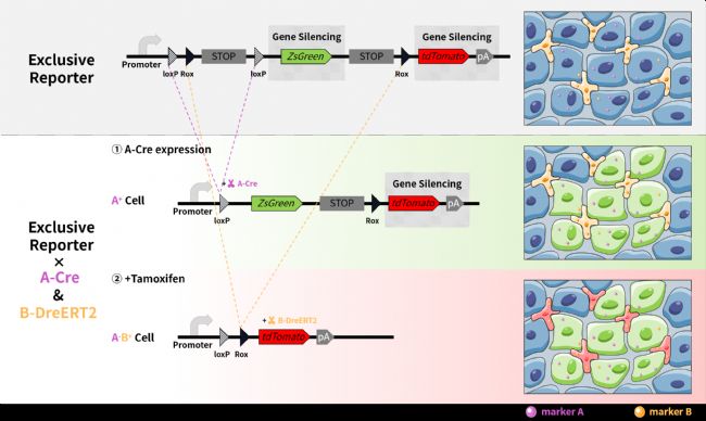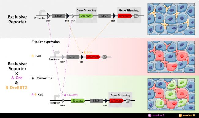 但如果您想標(biāo)記的細(xì)胞類型,他在胚胎發(fā)育期 markerA 表達(dá),但在成年后 markerA 不表達(dá),并且表達(dá)markerB。若我們采用獨(dú)家報(bào)告基因系統(tǒng),使用A-Cre與B-DreERT2,目的細(xì)胞仍無法成功標(biāo)記。