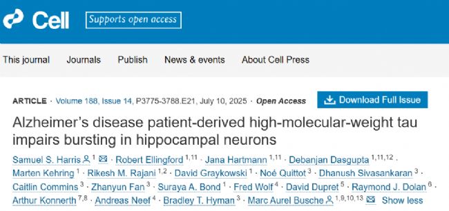 2025年7月10日,美國,德國,英國,瑞士,印度的學者在Cell期刊上聯(lián)合發(fā)表了題名為“Alzheimer’s disease patient-derived high-molecular-weight tau impairs bursting in hippocampal neurons”的研究論文。