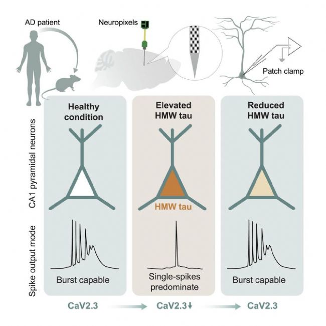 該研究揭示了tau蛋白積累導致阿爾茨海默。ˋD)認知障礙的細胞機制。通過小鼠模型體內(nèi)電生理記錄發(fā)現(xiàn),tau(獨立于β-淀粉樣蛋白)會選擇性損害海馬CA1神經(jīng)元的復雜簇狀放電——這一支撐學習記憶的關(guān)鍵電活動模式。這種損傷伴隨與放電模式相關(guān)的網(wǎng)絡(luò)活動異常(如θ節(jié)律和高頻漣漪波),并同步于CaV2.3鈣通道表達的減少。研究進一步從AD患者腦組織中分離出可溶性高分子量(HMW)tau,證實其是抑制簇狀放電的關(guān)鍵tau亞型,納摩爾濃度即可引發(fā)效應(yīng)。