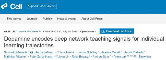 2025年7月10日,英國及中國的學者在Cell期刊上聯(lián)合發(fā)表了題名為“Dopamine encodes deep network teaching signals for individual learning trajectories”的研究論文。