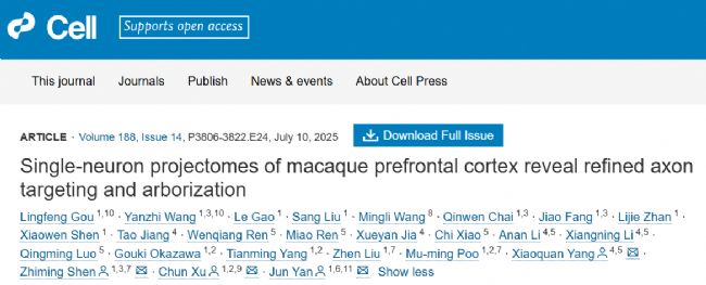 2025年7月10日,中國科學院腦智卓越中心嚴軍、徐春、沈志明研究員團隊以及華中科技大學蘇州腦空間信息研究院的楊孝全教授團隊在Cell期刊上聯(lián)合發(fā)表了題名為“Single-neuron projectomes of macaque prefrontal cortex reveal refined axon targeting and arborization”的研究論文。