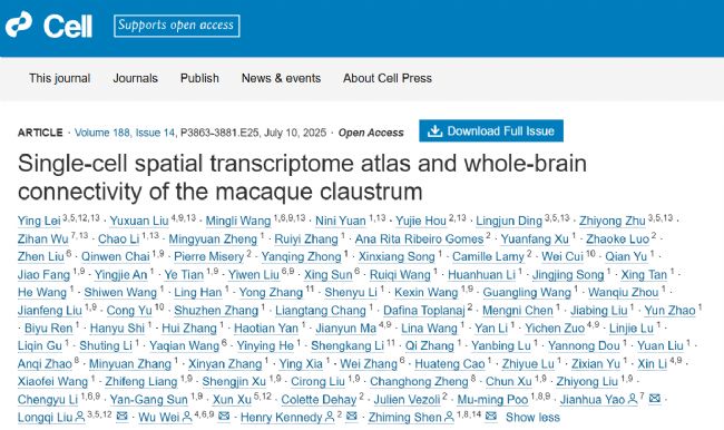 2025年7月10日,中國科學院腦科學與智能技術(shù)卓越創(chuàng)新中心和上海腦科學與類腦研究中心沈志明研究員團隊、法國國家衛(wèi)生與醫(yī)學研究院干細胞與腦研究所Henry Kennedy研究員團隊、臨港實驗室魏武研究員團隊、華大生命科學研究院劉龍奇研究員團隊、騰訊生命科學實驗室姚建華研究員團隊在Cell期刊上聯(lián)合發(fā)表了題名為“Single-cell spatial transcriptome atlas and whole-brain connectivity of the macaque claustrum”的研究論文。