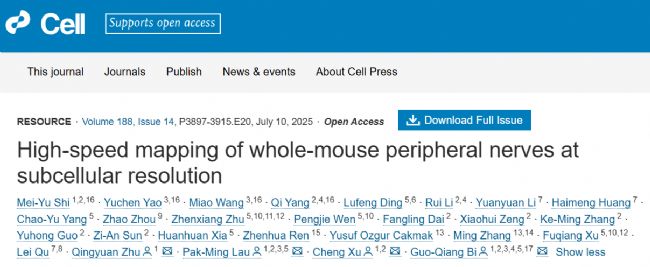 2025年7月10日,中國科學技術(shù)大學合肥微尺度物質(zhì)科學國家研究中心和生命科學與醫(yī)學部畢國強教授團隊、劉北明教授團隊,聯(lián)合合肥綜合性國家科學中心人工智能研究院和中國科學院深圳先進技術(shù)研究院團隊在Cell期刊上聯(lián)合發(fā)表了題名為“High-speed mapping of whole-mouse peripheral nerves at subcellular resolution”的研究論文。