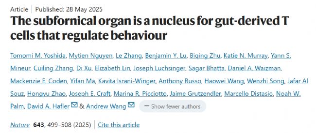 2025年5月28日,美國學者在Nature期刊上發(fā)表了題名為“The subfornical organ is a nucleus for gut-derived T cells that regulate behaviour”的研究論文。