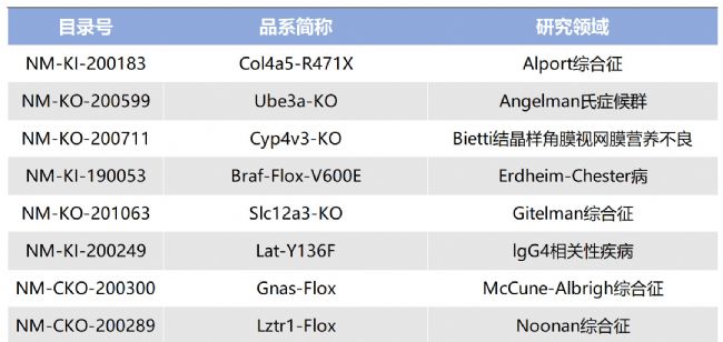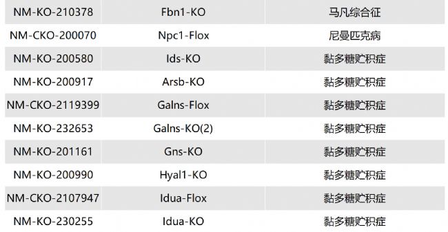 南模生物開發(fā)了上百種罕見病相關(guān)小鼠模型,為罕見病的病理研究、藥效評估和藥物安全性評價提供了強有力的工具,部分品系信息如下: