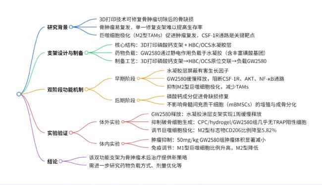- 研究目的:構(gòu)建兼具調(diào)節(jié)免疫微環(huán)境和促進骨再生功能的雙階段 3D 打印支架,用于骨腫瘤術(shù)后治療。