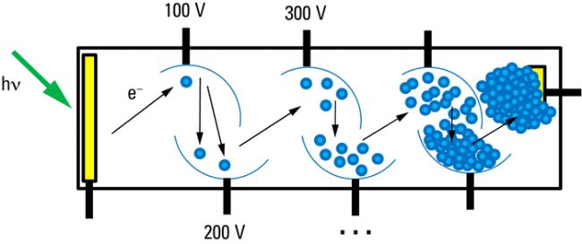 通過高電壓加速光電子,可以使“單光子”信號獲得遠(yuǎn)高于光子本身能量的能量:這就是信號增益。