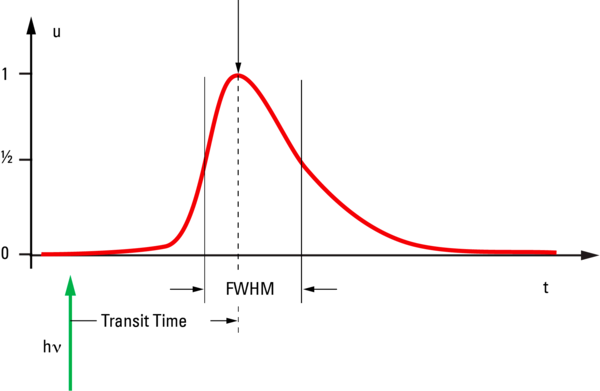 圖5:PMT陽極的電荷脈沖形狀。吸收光子(綠色箭頭)后,電荷會在一定時間后迅速增加,然后以較慢的速率下降。光子到達(dá)與脈沖峰值之間的時間稱為渡越時間(TT)。脈沖寬度用半峰全寬(FWHM)表示。
