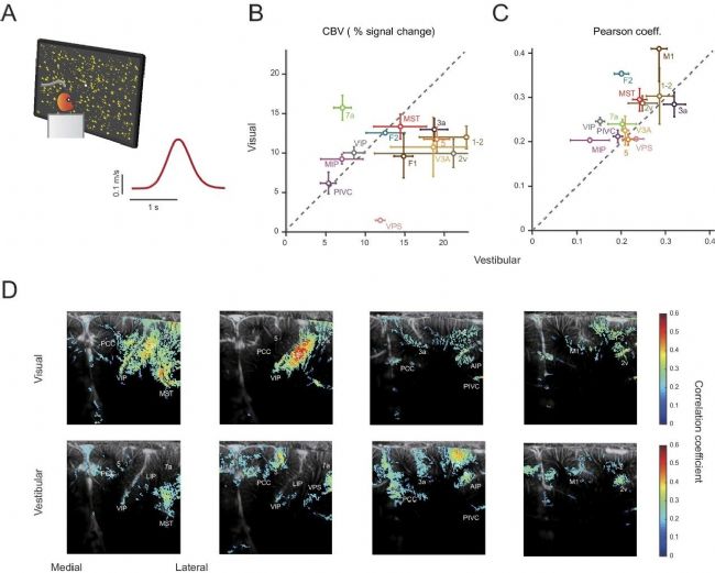 結(jié)合視覺(jué)光流實(shí)驗(yàn),發(fā)現(xiàn)12個(gè)雙模態(tài)腦區(qū)(如MSTd、VIP),證實(shí)前庭與視覺(jué)信號(hào)的交互。